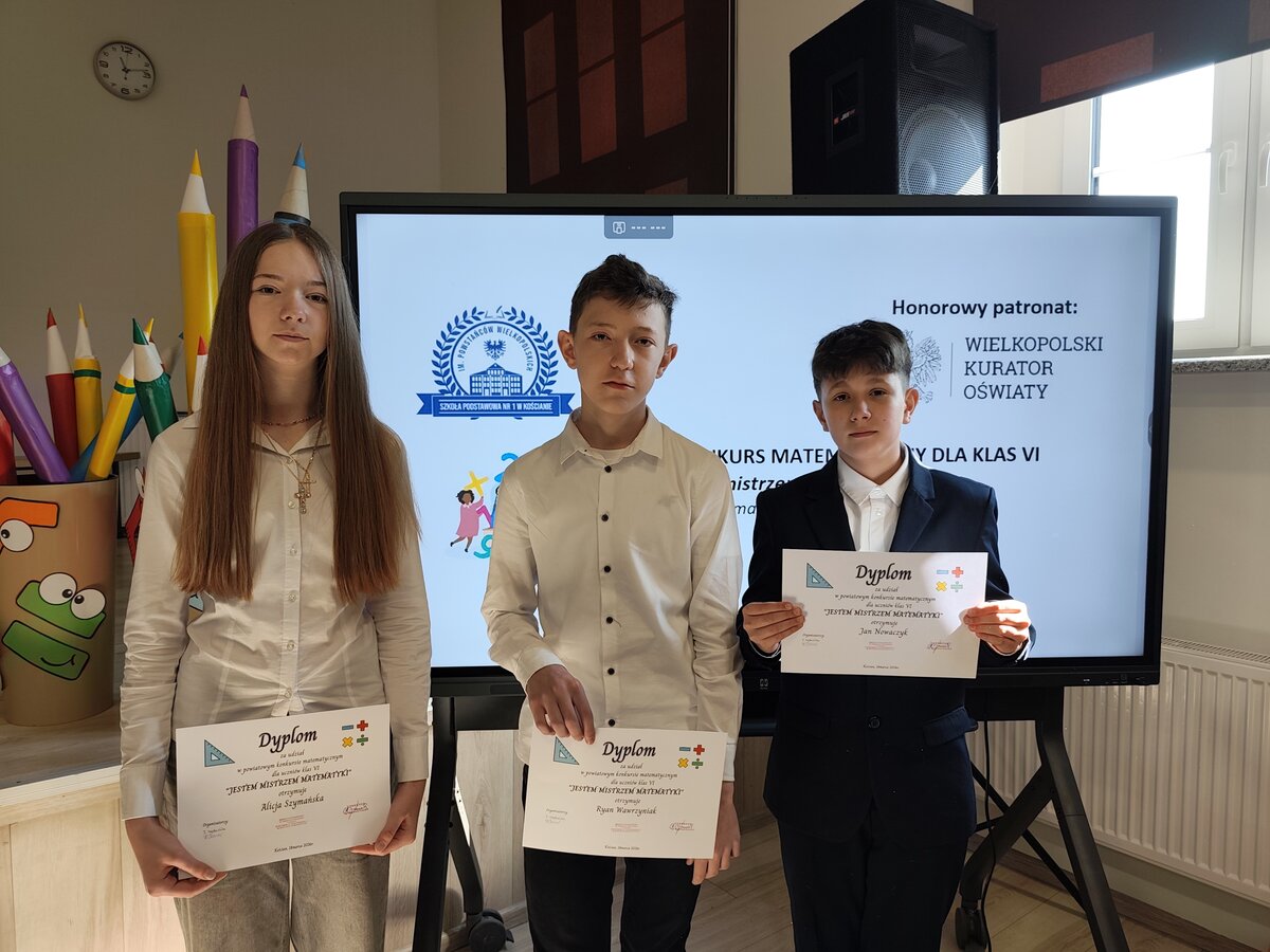 18 marca uczniowie klas szóstych naszej szkoły wzięli udział w Powiatowym Konkursie Matematycznym „Jestem Mistrzem Matematyki”, który odbył się w Szkole Podstawowej nr 1 w Kościanie.
