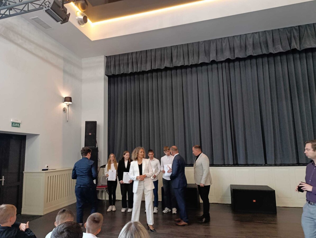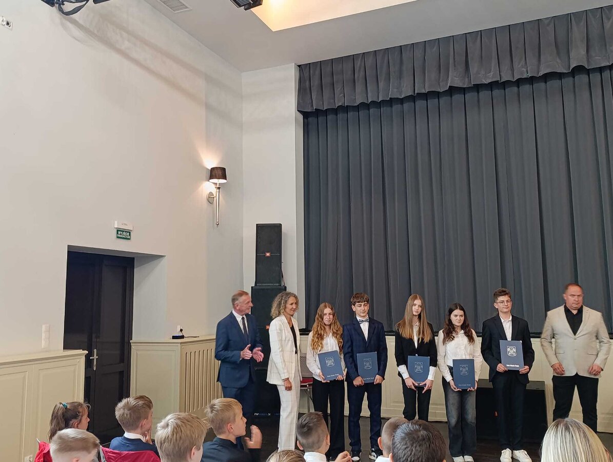 11 czerwca 2025 r. w Centrum Kultury w Śmiglu odbyło się wręczenie nagród w konkursach pod patronatem Burmistrza Śmigla oraz za wysokie wyniki w nauce, sporcie i aktywność społeczną. Wydarzenie rozpoczęło się od powitania gości przez p. Burmistrz, która podkreśliła cechy wyróżnionych uczniów. Wymieniła m.in. zaangażowanie, pasję i wytrwałość w dążeniu do celu. Słowa uznania skierowane zostały też do nauczycieli, wychowawców, rodziców, których wsparcie, cierpliwość i codzienna praca przyczyniły się do rozwoju i sukcesów uczniów.