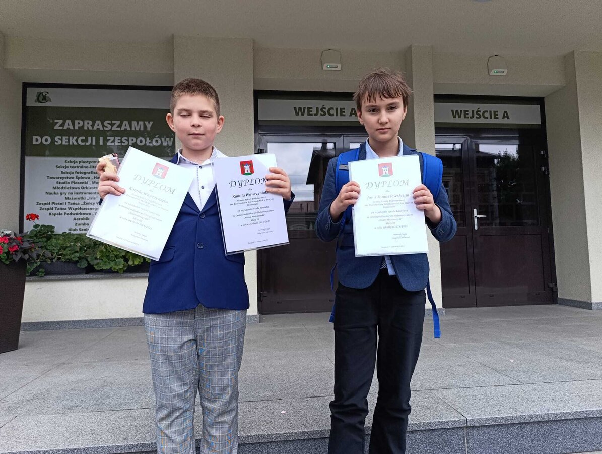 Mikołaj Złotkowski - kl. 8a - nagrodzony za godne reprezentowanie szkoły w różnych konkursach szkolnych i pozaszkolnych na szczeblu gminnym, powiatowym, wojewódzkim i ogólnopolskim osiągając przy tym wysokie wyniki. Chętnie również angażuje się w przygotowania uroczystości szkolnych,