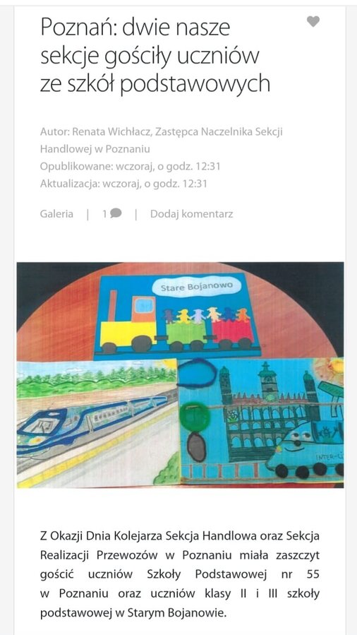 W czwartek, 21 listopada klasy 2a i 2b wybrały się na wycieczkę pociągiem do Poznania, a klasy 3a i 3b we wtorek 26 listopada. Celem wycieczki było poznanie zawodu kolejarza z okazji zbliżającego się Święta Kolejarzy – 25 listopada. Inicjatorem wyjazdu była pani Marciniak – mama uczennicy klasy 2a. Uczniowie poznali różne miejsca pracy i ich pracowników – maszynistów, kasjerki, rewidentów, pracowników drużyn konduktorskich oraz panią naczelnik. Byli w budynku Sekcji, w kasach biletowych oraz na Dworcu Głównym. Największą atrakcją był przejazd próżnym składem pociągu PKP Intercity, obejrzenie kabiny maszynisty podczas wodowania lokomotywy spalinowej. Miłą niespodzianką dla wszystkich uczniów były upominki od PKP Intercity.