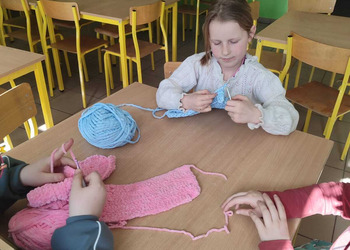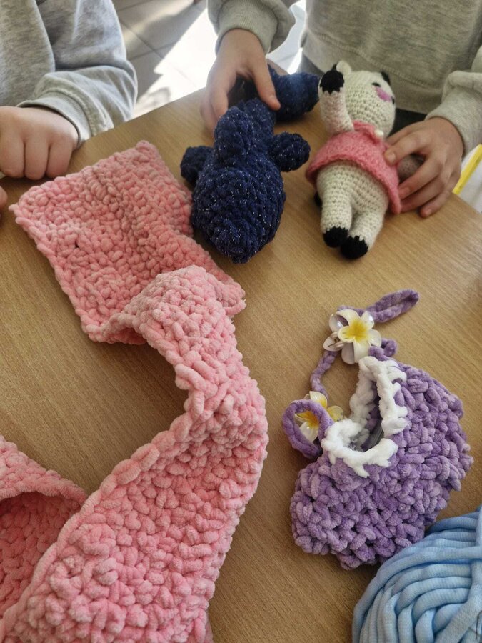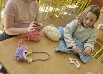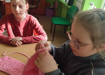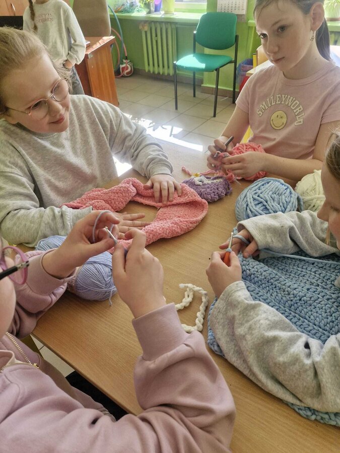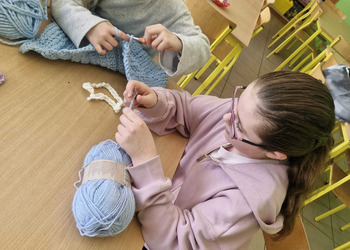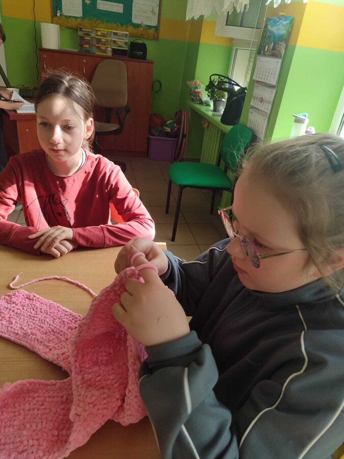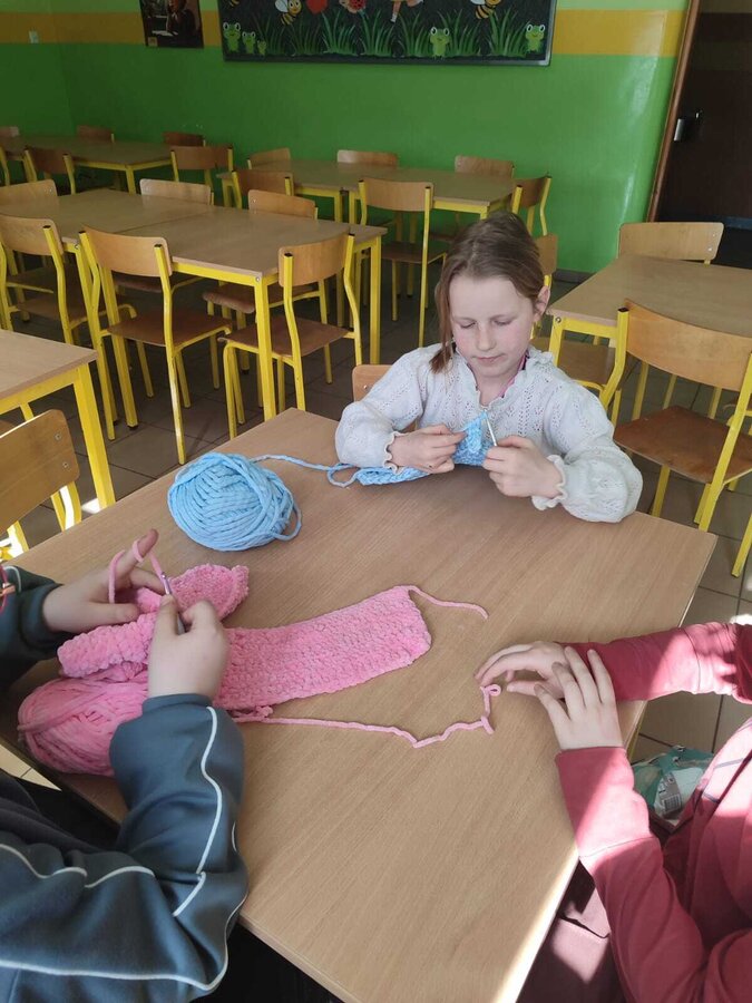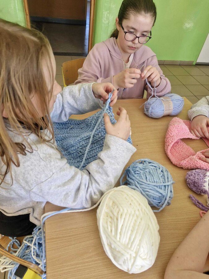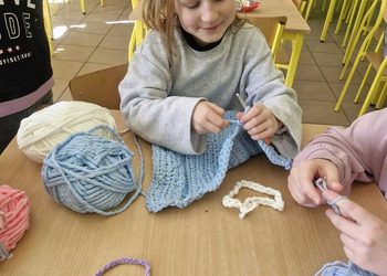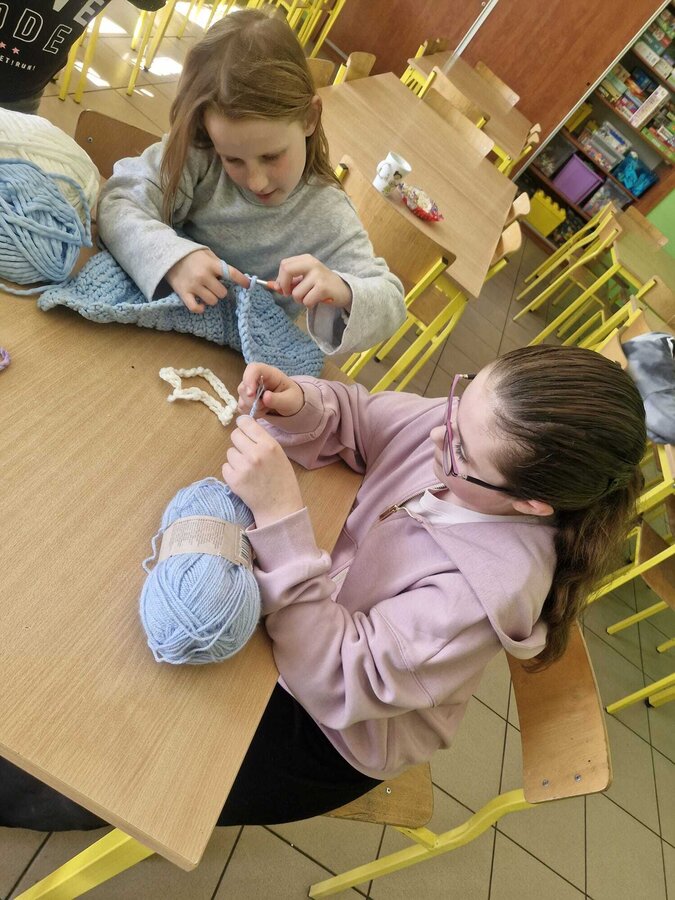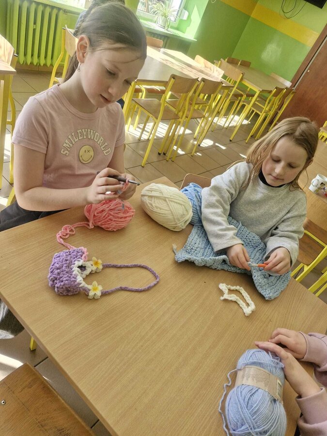 Uczennice klasy 3a bardzo twórczo wykorzystują czas podczas pobytu w świetlicy szkolnej oraz podczas przerw międzylekcyjnych. Zamiast spędzać go przed ekranem telefonu, chętnie sięgają po szydełko i włóczkę. Dziewczynki z dużym zaangażowaniem rozwijają swoje umiejętności rękodzielnicze. Do tej pory stworzyły już wiele pięknych prac - między innymi: szaliki, torebki, biżuterię oraz inne małe cudeńka. Szydełkowanie nie tylko rozwija kreatywność, cierpliwość i zdolności manualne, ale także daje wiele radości i satysfakcji z własnoręcznie wykonanych prac. To wspaniały przykład na to, że wolny czas można spędzać twórczo i pożytecznie, a takie zajęcie jest zdecydowanie lepszą alternatywą niż ciągłe korzystanie z telefonu.
