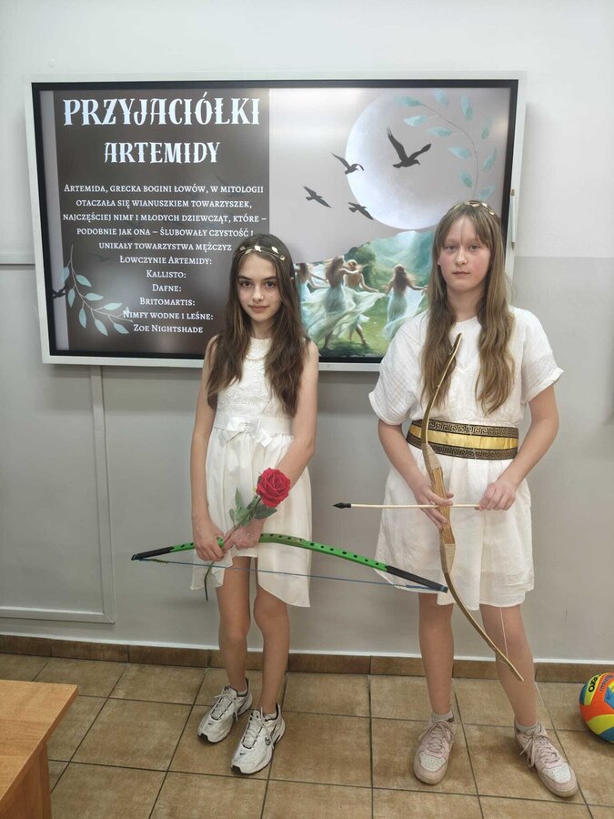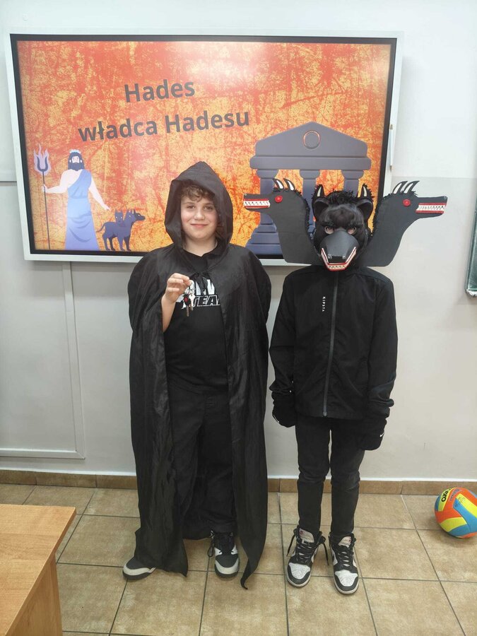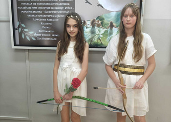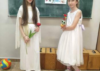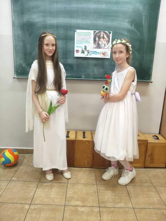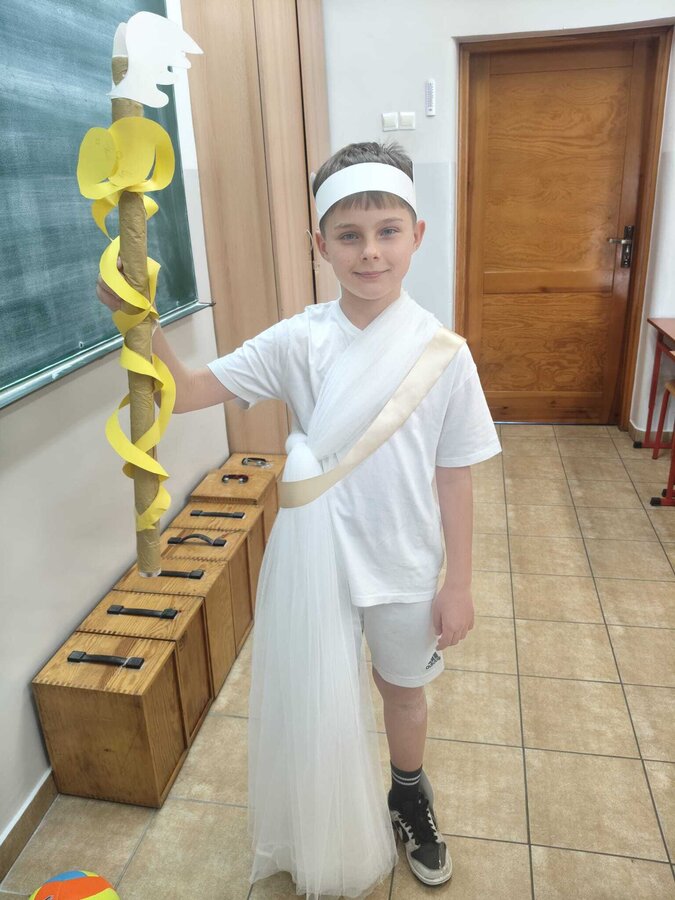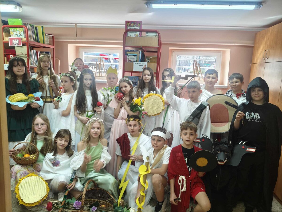 Uczniowie klasy 5A postanowili oryginalnie podsumować pracę z mitologią grecką, dlatego podczas lekcji języka polskiego udali się do ciepłej starożytnej Grecji. Starannie i kreatywnie wykonali atrybuty, przebrania, makijaże, by wcielić się w role bogów czy herosów greckich. Przewodził im oczywiście gromowładny Zeus, nie zabrakło również Hery, Afrodyty, Apolla, Hadesa, Artemidy, Hermesa, Ateny, Demeter, Persefony czy Cerbera. Tak oto zacni goście zebrali się na Olimpie na uczcie wydanej przez Zeusa. Każdy z uczniów przygotował prezentację wybranego boga olimpijskiego oraz zagadkę dla rówieśników, aby przybliżyć i utrwalić wiedzę o atrybutach i związkach frazeologicznych pochodzących z mitologii. Bogowie olimpijscy nie omieszkali tego dnia odwiedzić również biblioteki.