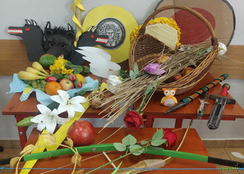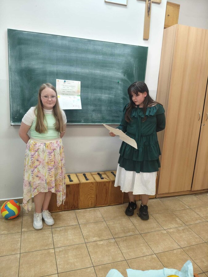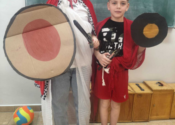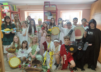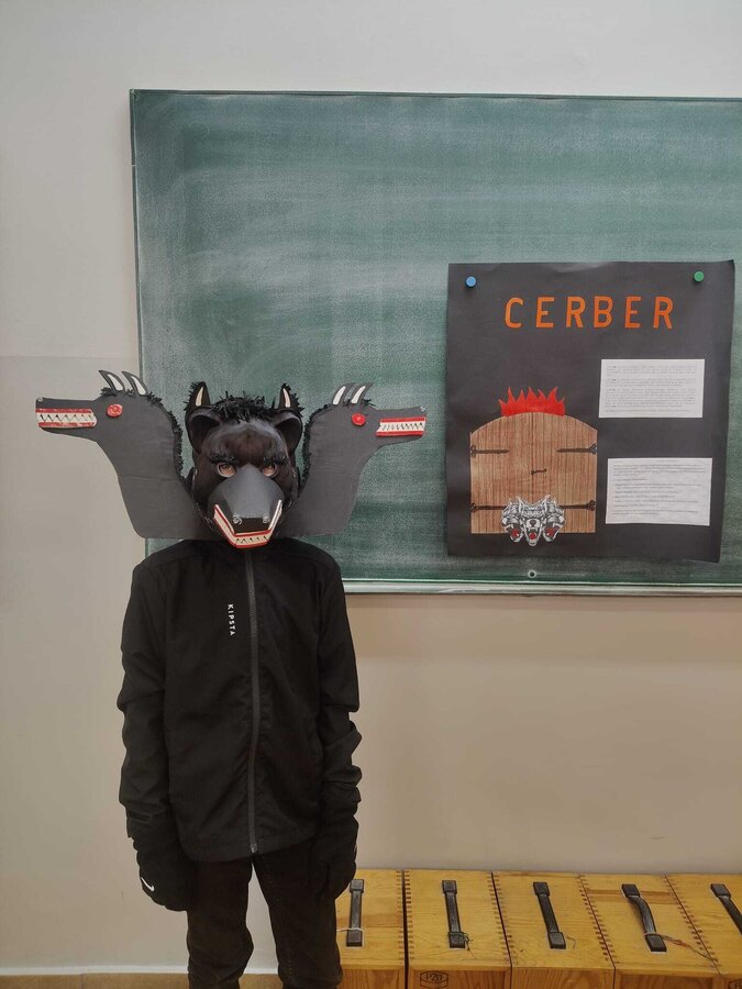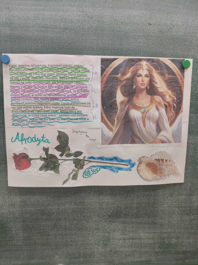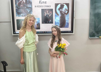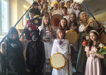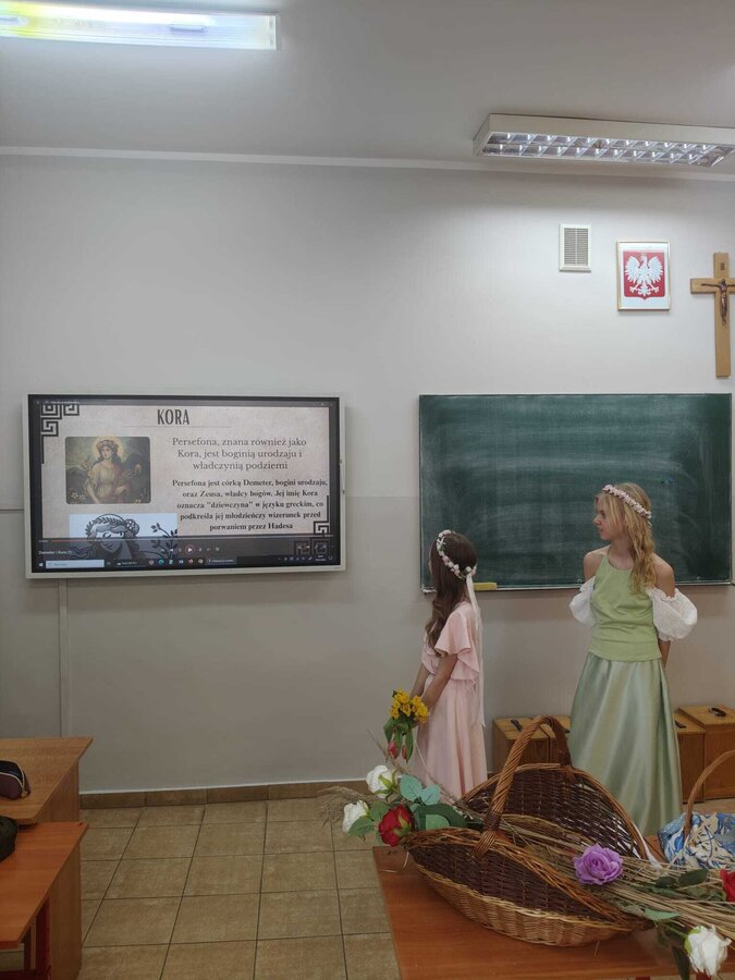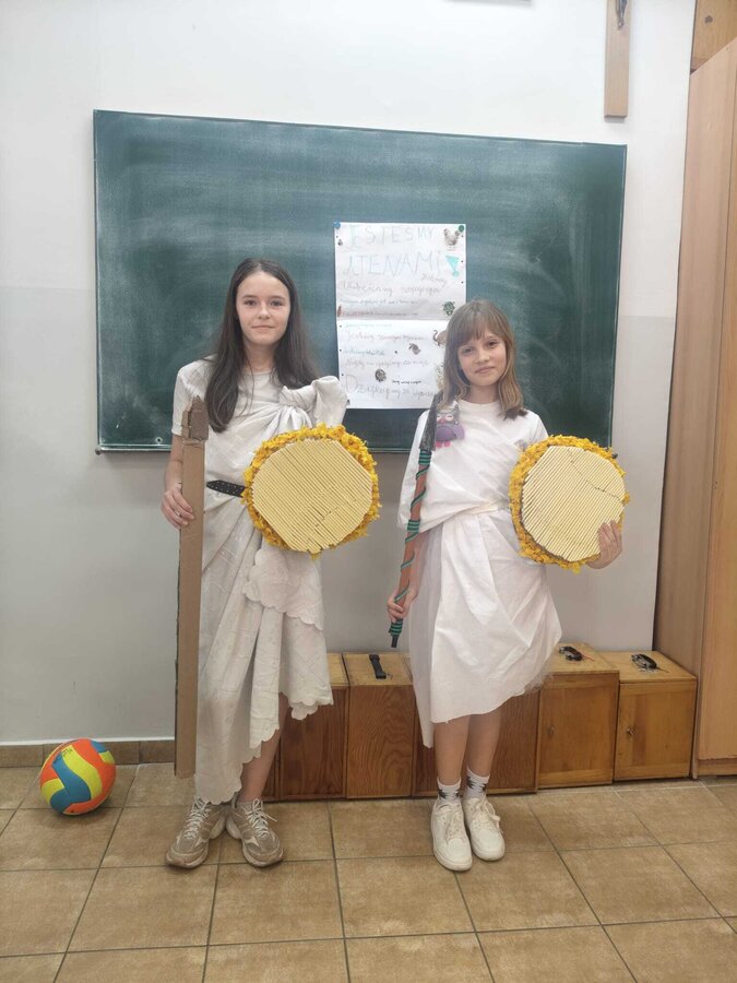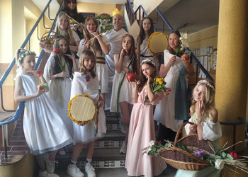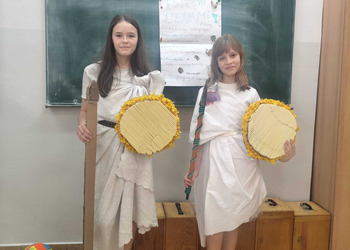 Uczniowie klasy 5A postanowili oryginalnie podsumować pracę z mitologią grecką, dlatego podczas lekcji języka polskiego udali się do ciepłej starożytnej Grecji. Starannie i kreatywnie wykonali atrybuty, przebrania, makijaże, by wcielić się w role bogów czy herosów greckich. Przewodził im oczywiście gromowładny Zeus, nie zabrakło również Hery, Afrodyty, Apolla, Hadesa, Artemidy, Hermesa, Ateny, Demeter, Persefony czy Cerbera. Tak oto zacni goście zebrali się na Olimpie na uczcie wydanej przez Zeusa. Każdy z uczniów przygotował prezentację wybranego boga olimpijskiego oraz zagadkę dla rówieśników, aby przybliżyć i utrwalić wiedzę o atrybutach i związkach frazeologicznych pochodzących z mitologii. Bogowie olimpijscy nie omieszkali tego dnia odwiedzić również biblioteki.