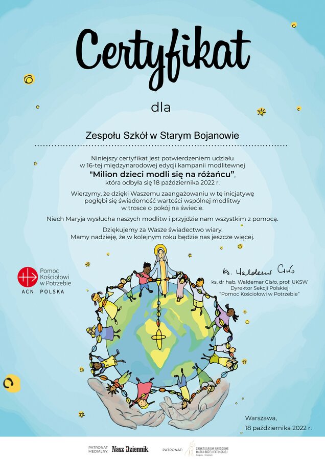 W ramach kampanii Stowarzyszenia Pomoc Kościołowi w Potrzebie „Milion dzieci modli się na różańcu” otrzymaliśmy certyfikat uczestnictwa w tym pięknym dziele.