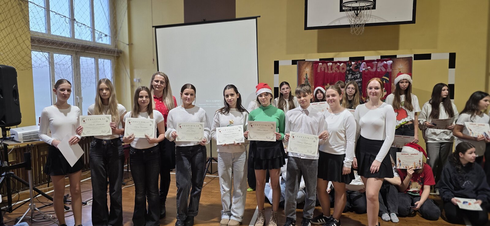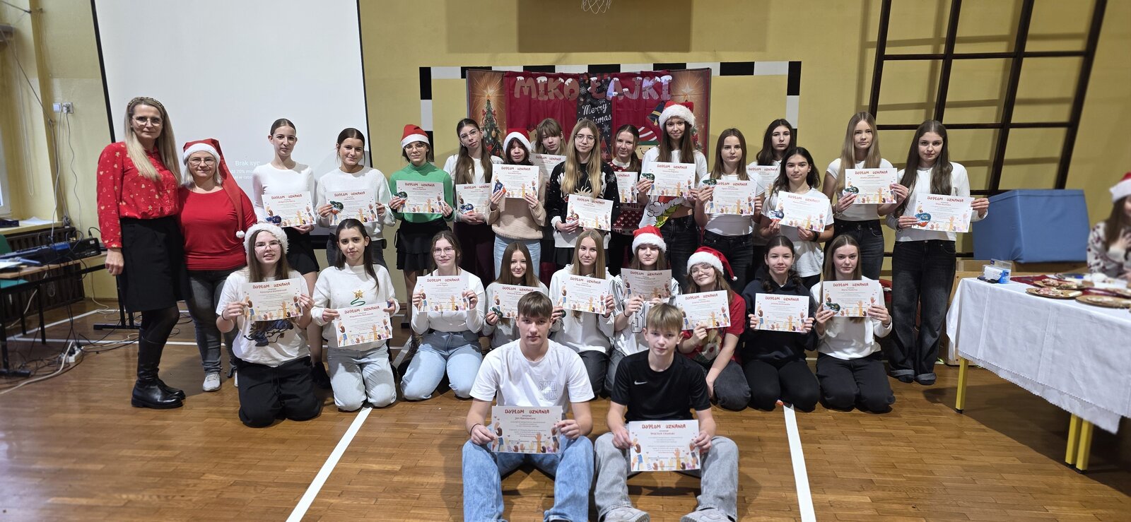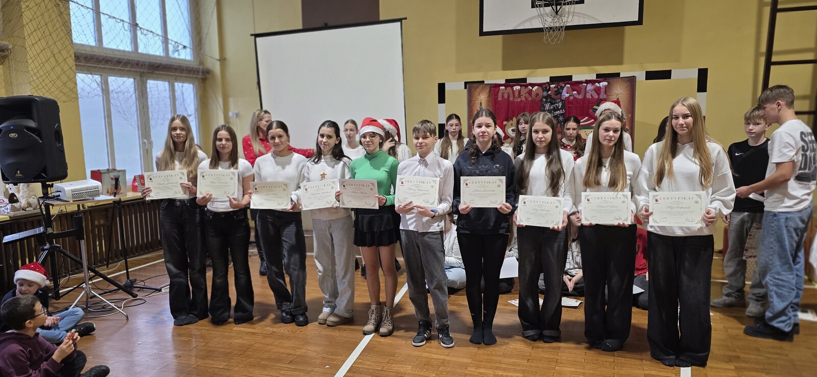 W przeddzień Dnia Wolontariusza uczniowie klas 4–8 wzięli udział w szkolnej akcji „Misja Dobra”. Na czterech stanowiskach czekały na nich zadania: puzzle, szyfry, wykreślanka i dopasowywanie uczynków. Za każde poprawnie wykonane zadanie uczniowie zdobywali pieczątki, a komplet czterech pozwalał wziąć udział w losowaniu nagród. Wydarzenie poprowadziły z ogromnym zaangażowaniem wolontariuszki z klasy 8b, które przez wszystkie przerwy tłumaczyły zadania, sprawdzały odpowiedzi i przybijały pieczątki. Podczas Mikołajek wyróżniliśmy również uczniów, którzy przez cały rok aktywnie działają w wolontariacie i zawsze można na nich liczyć. Dziękujemy wszystkim uczestnikom za udział, a wolontariuszom za tworzenie dobra każdego dnia! ♥