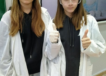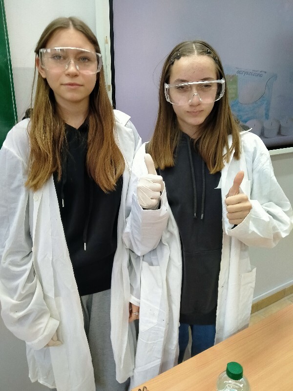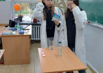 Uczennice klasy 7 wykonały przed całą klasą, przygotowane samodzielnie doświadczenie, w którym otrzymują i badają właściwości tlenku węgla (IV).