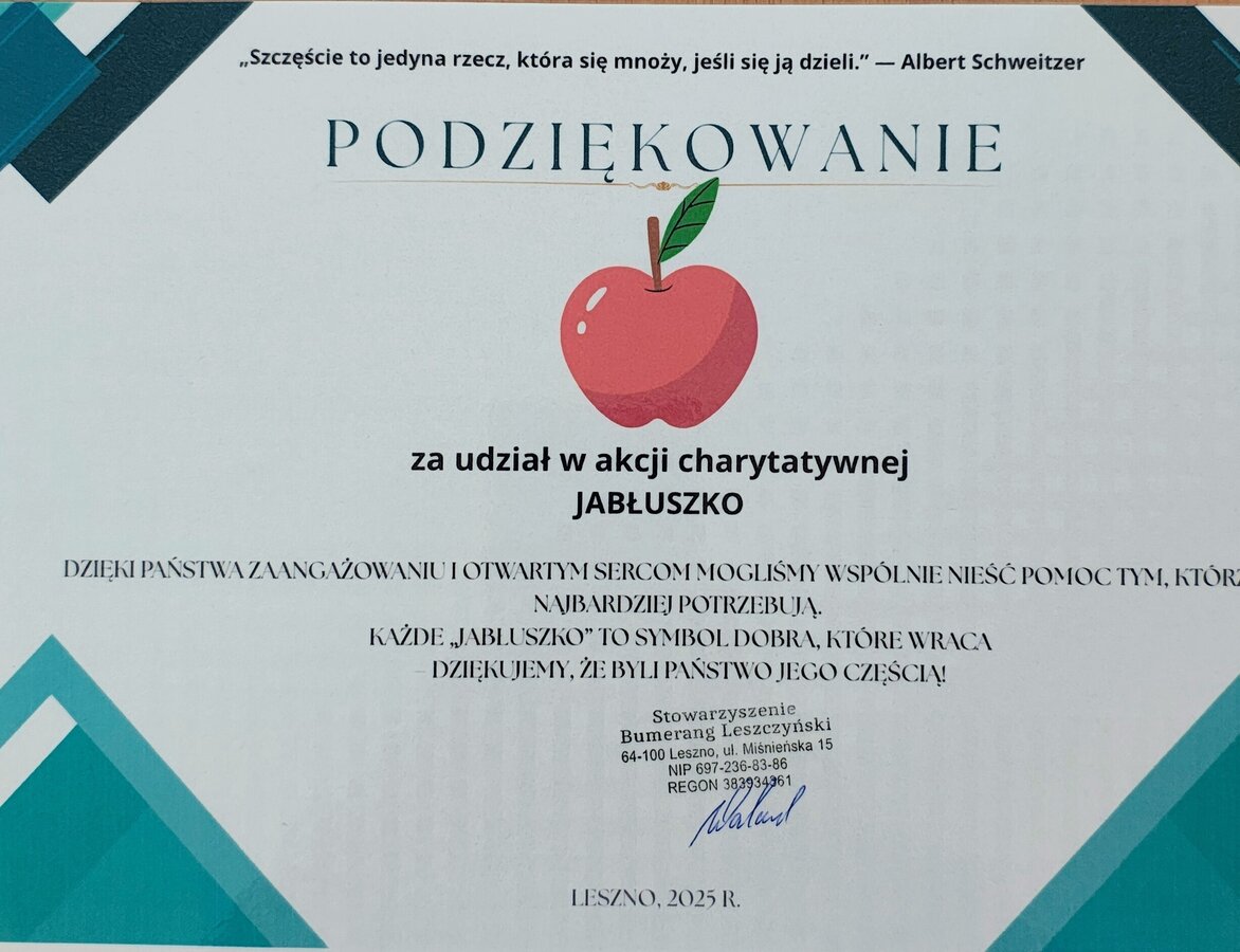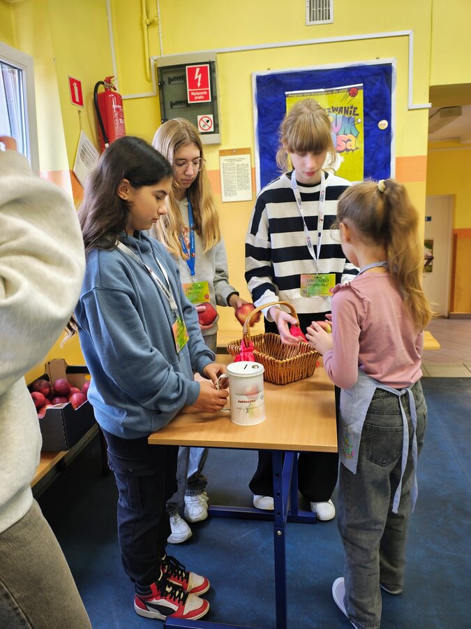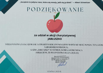 W dniu 22 października szkolny wolontariat przeprowadził akcję charytatywną "JABŁUSZKO", której celem było zebranie środków na leczenie chorych dzieci. Akcja spotkała się z dużym odzewem ze strony uczniów, nauczycieli i pracowników szkoły. Wolontariusze i cała społeczność szkolna udowodnili, że mają wielkie serca i potrafią wspólnie działać w słusznej sprawie. Dziękujemy wszystkim zaangażowanym osobom.
