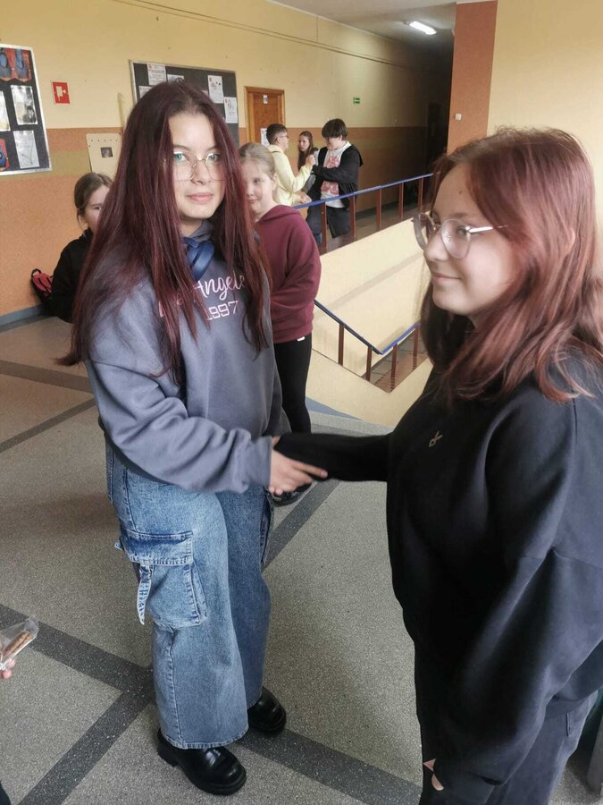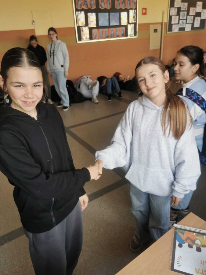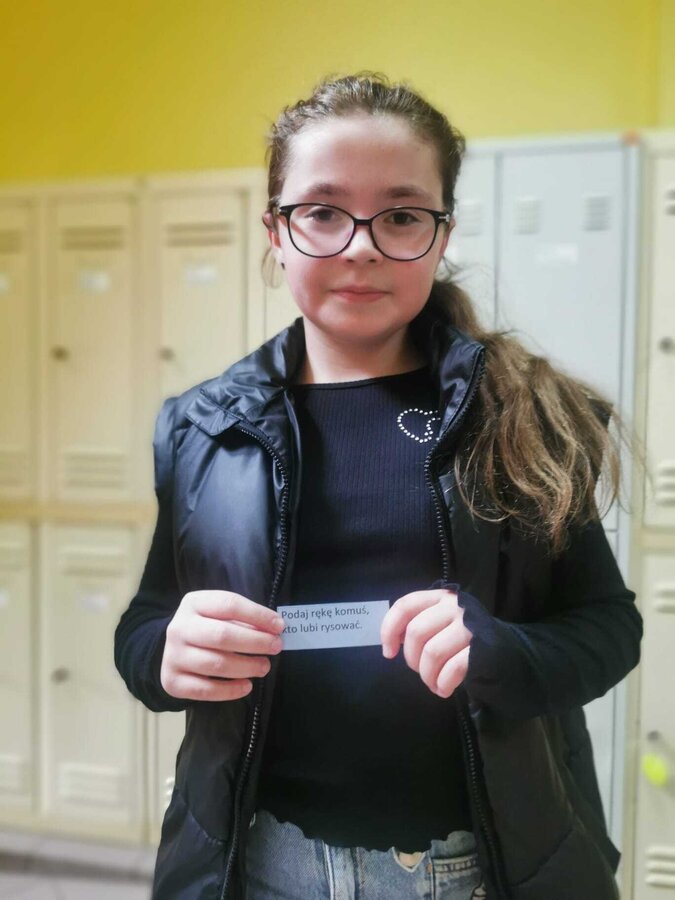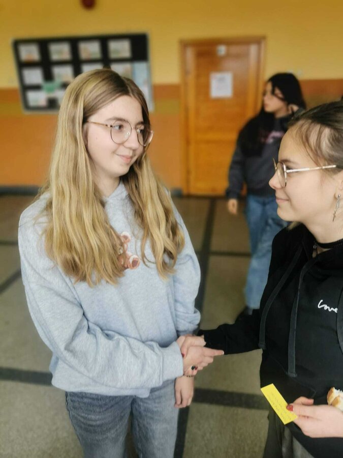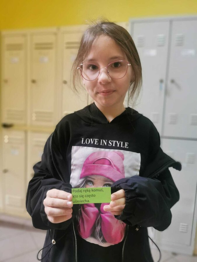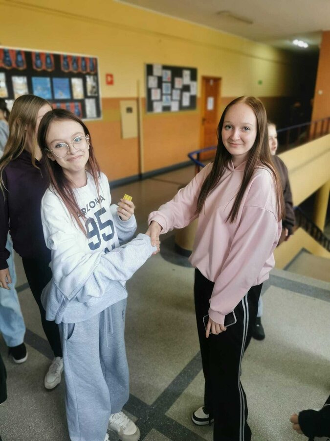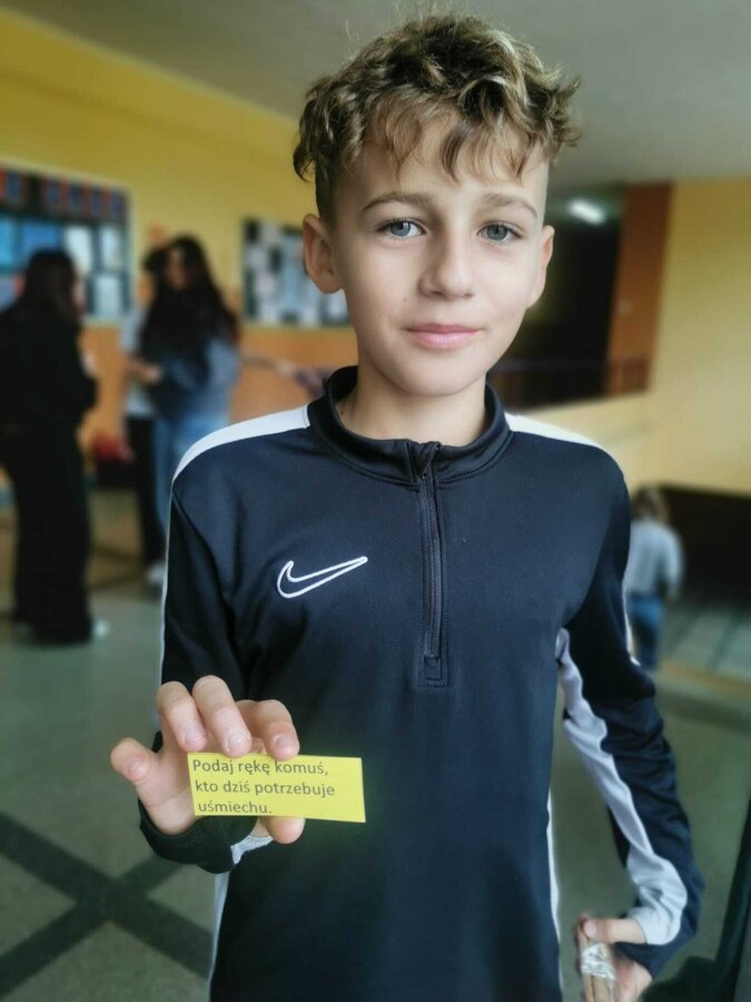 - Wtorek – „Podaj rękę komuś...” Podczas przerw szkolnych odbyła się akcja integracyjna. Uczniowie losowali karteczki z hasłami, np. „Podaj rękę komuś, kto lubi sport” lub „Podaj rękę komuś, kogo dobrze nie znasz”, a następnie szukali odpowiedniej osoby. Dzięki zabawie na szkolnych korytarzach pojawiło się mnóstwo uśmiechów, rozmów i nowych znajomości.