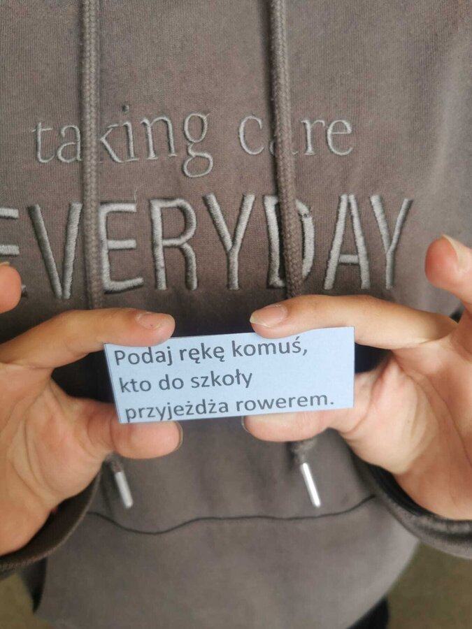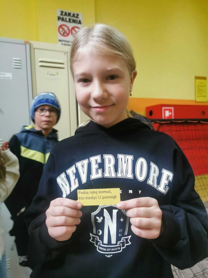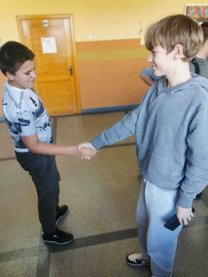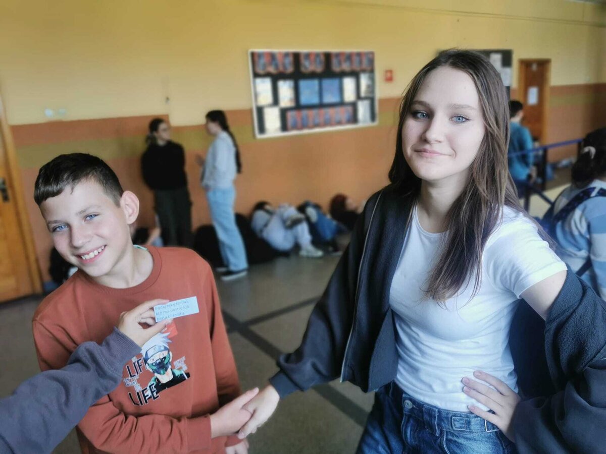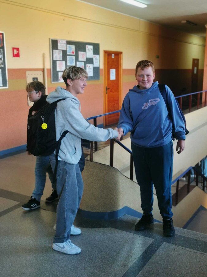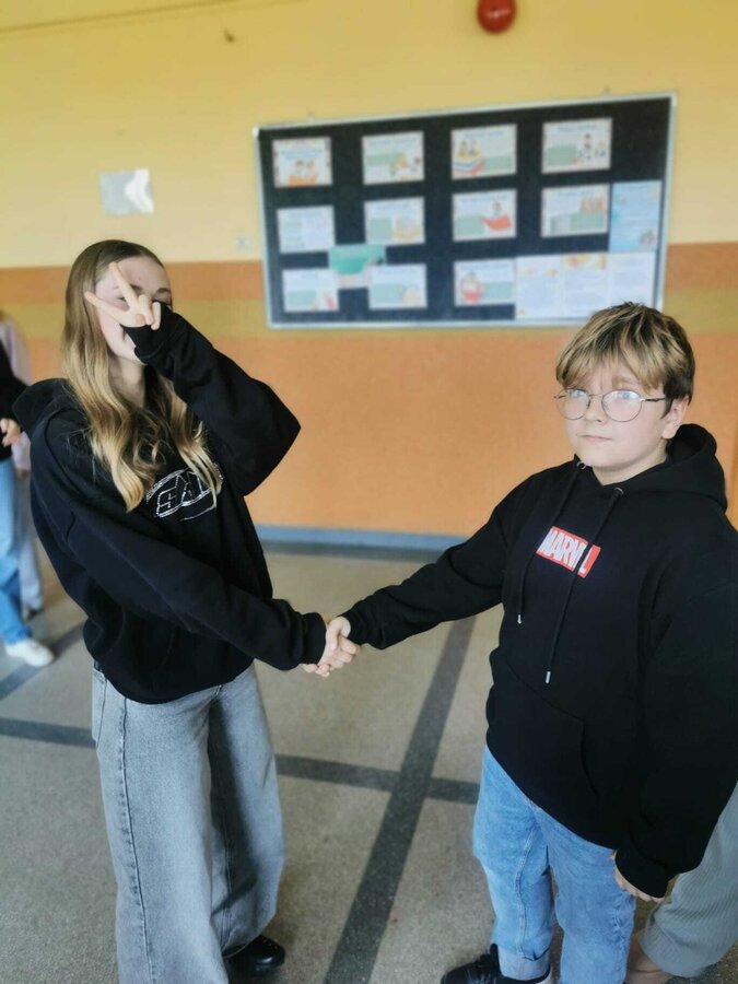 - Wtorek – „Podaj rękę komuś...” Podczas przerw szkolnych odbyła się akcja integracyjna. Uczniowie losowali karteczki z hasłami, np. „Podaj rękę komuś, kto lubi sport” lub „Podaj rękę komuś, kogo dobrze nie znasz”, a następnie szukali odpowiedniej osoby. Dzięki zabawie na szkolnych korytarzach pojawiło się mnóstwo uśmiechów, rozmów i nowych znajomości.