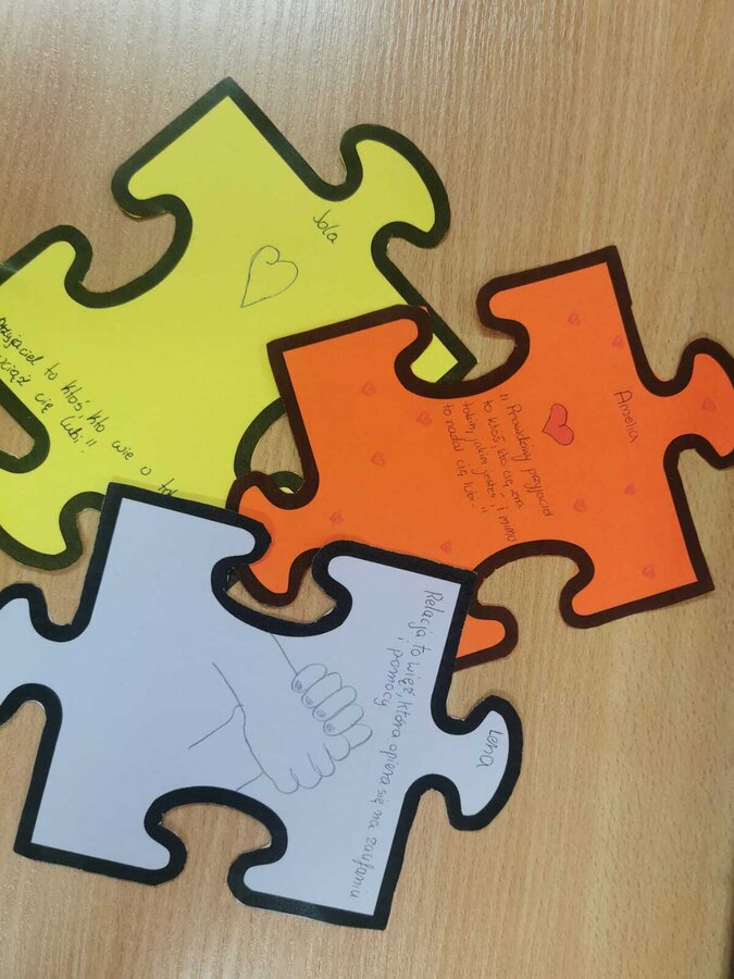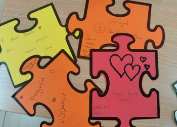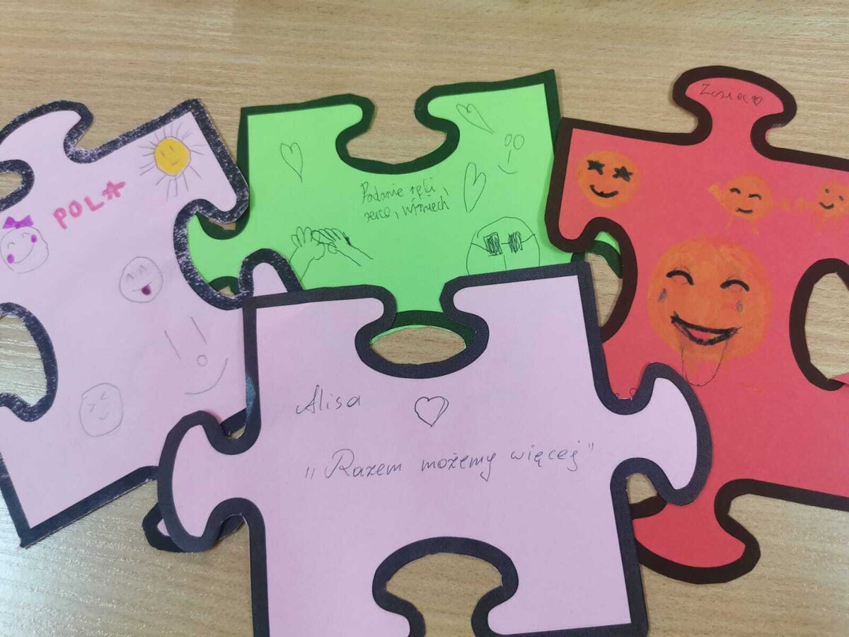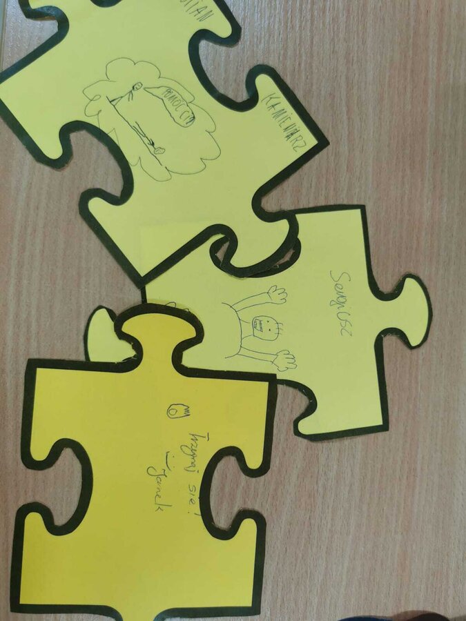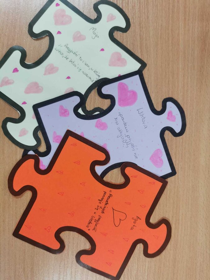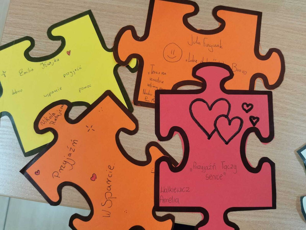 - Czwartek – „Mosty zamiast murów” Uczniowie wspólnie stworzyli mural z puzzli, którego każdy element symbolizował jedną osobę, Na puzzlach pojawiły się słowa takie jak przyjaźń, współpraca, empatia, pomoc, szacunek. Po złożeniu powstała kolorowa kompozycja pokazująca, że razem tworzymy całość.