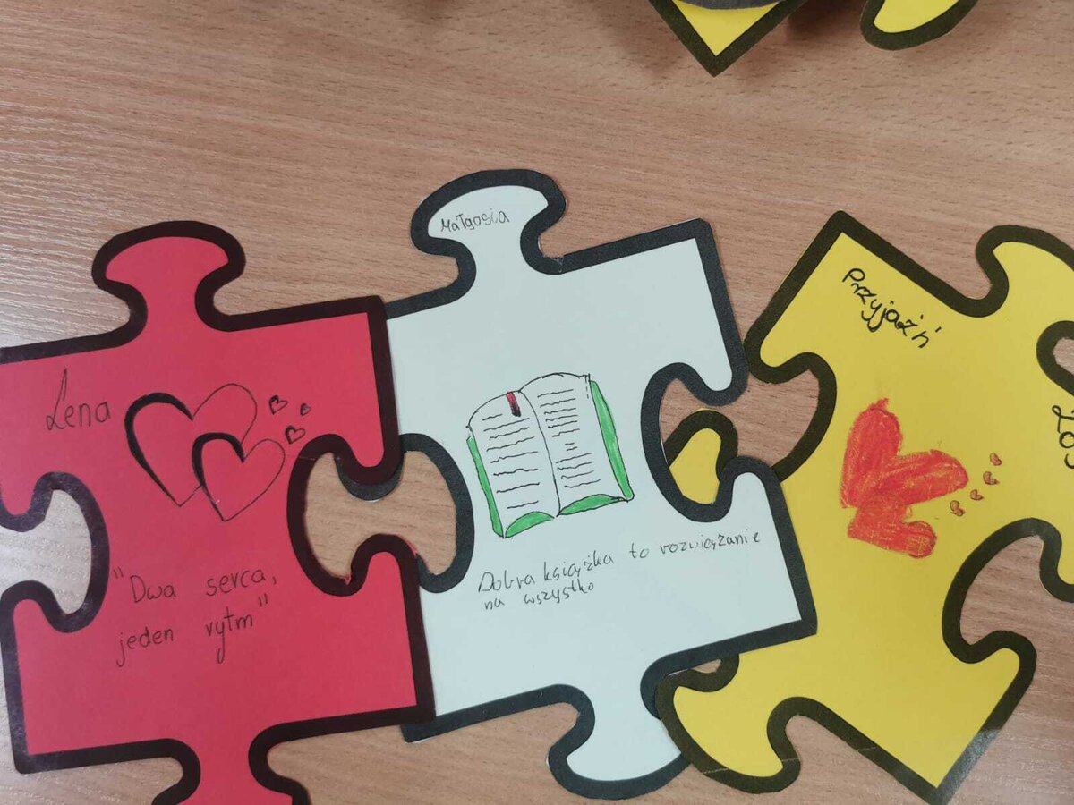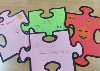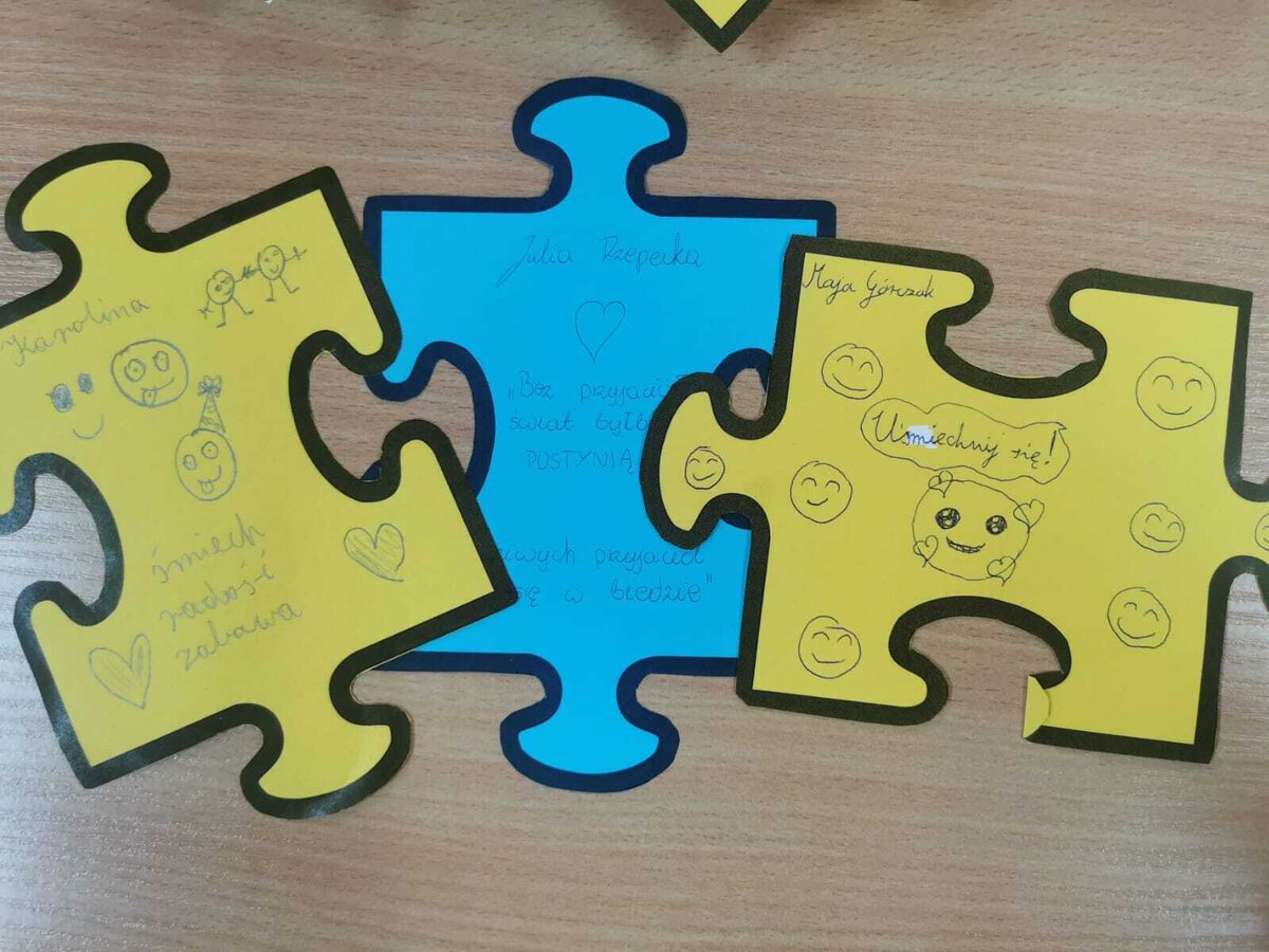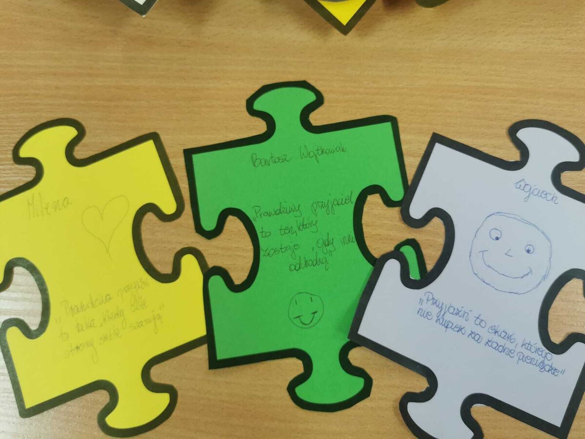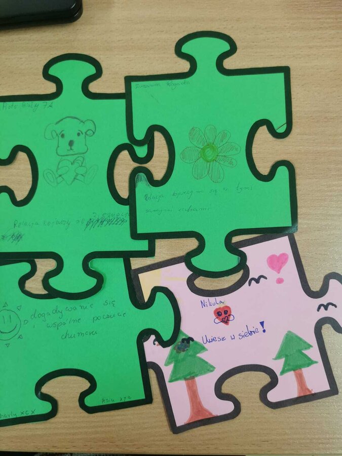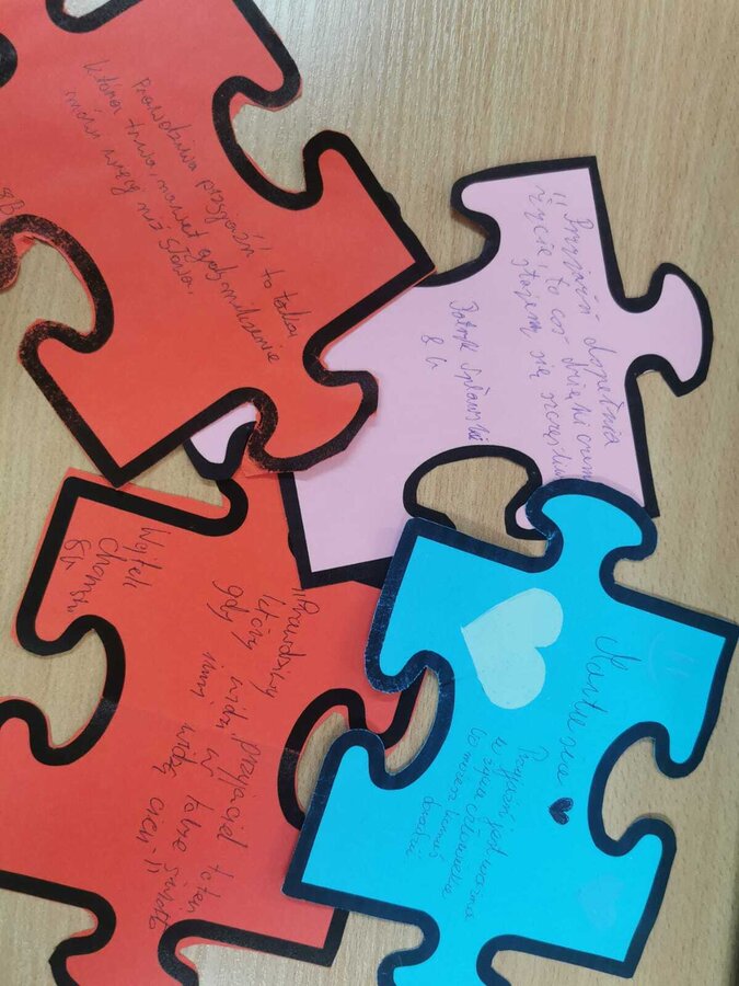 - Czwartek – „Mosty zamiast murów” Uczniowie wspólnie stworzyli mural z puzzli, którego każdy element symbolizował jedną osobę, Na puzzlach pojawiły się słowa takie jak przyjaźń, współpraca, empatia, pomoc, szacunek. Po złożeniu powstała kolorowa kompozycja pokazująca, że razem tworzymy całość.