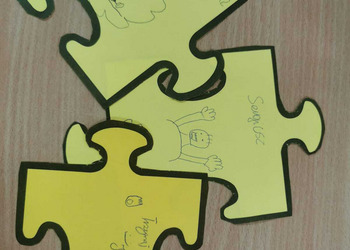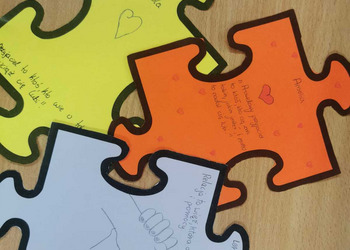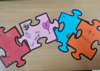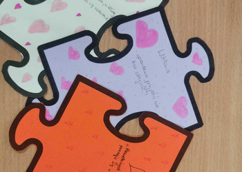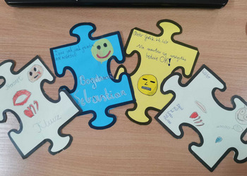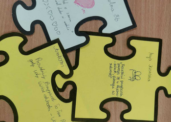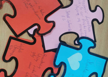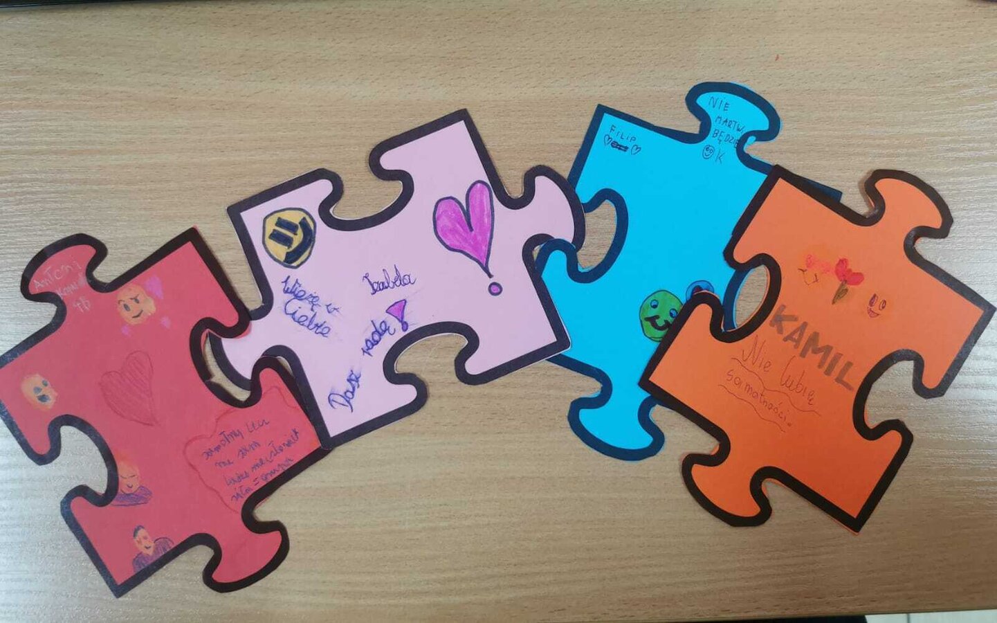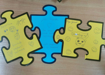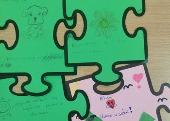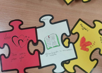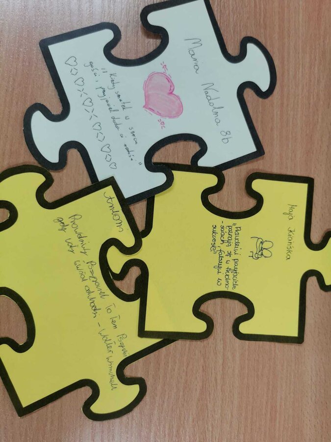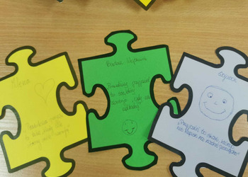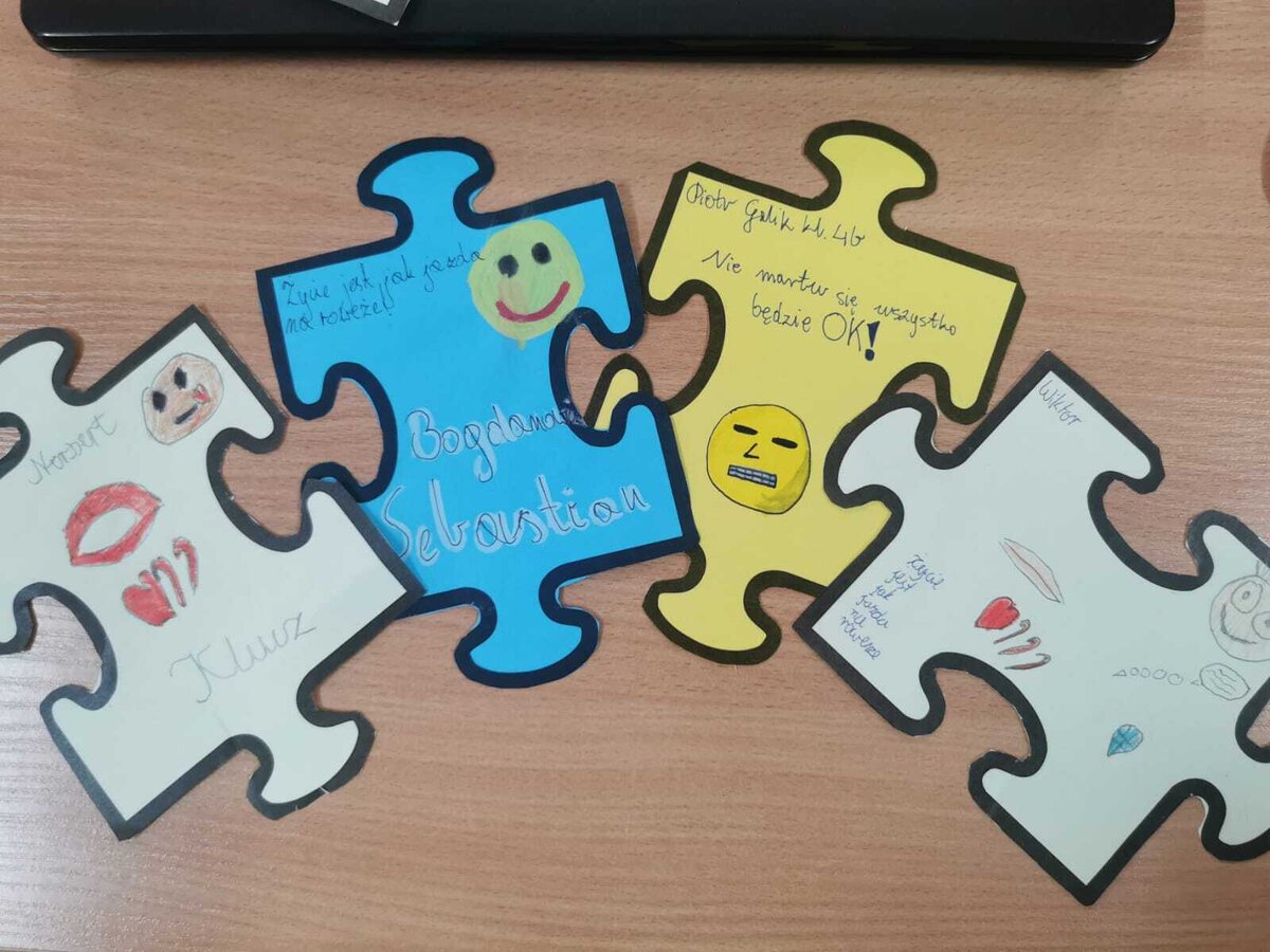 - Czwartek – „Mosty zamiast murów” Uczniowie wspólnie stworzyli mural z puzzli, którego każdy element symbolizował jedną osobę, Na puzzlach pojawiły się słowa takie jak przyjaźń, współpraca, empatia, pomoc, szacunek. Po złożeniu powstała kolorowa kompozycja pokazująca, że razem tworzymy całość.