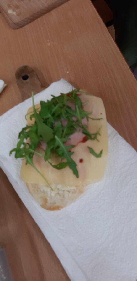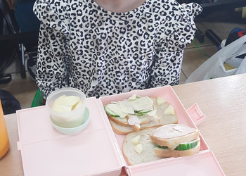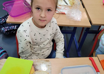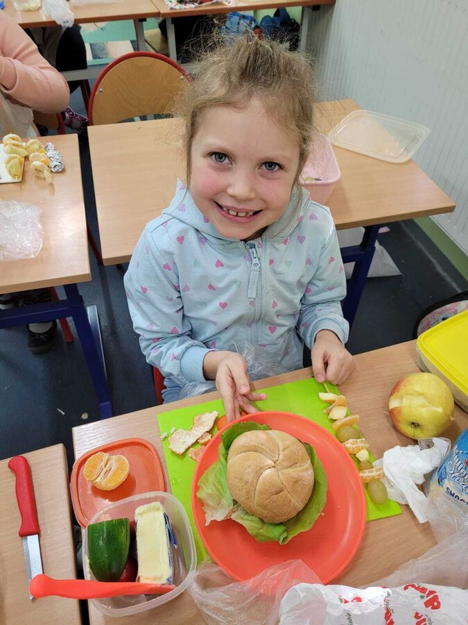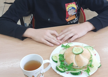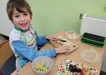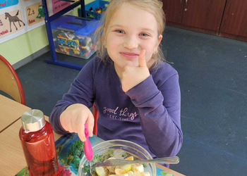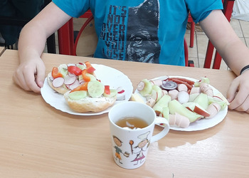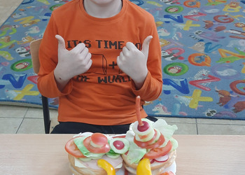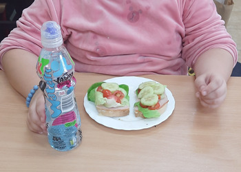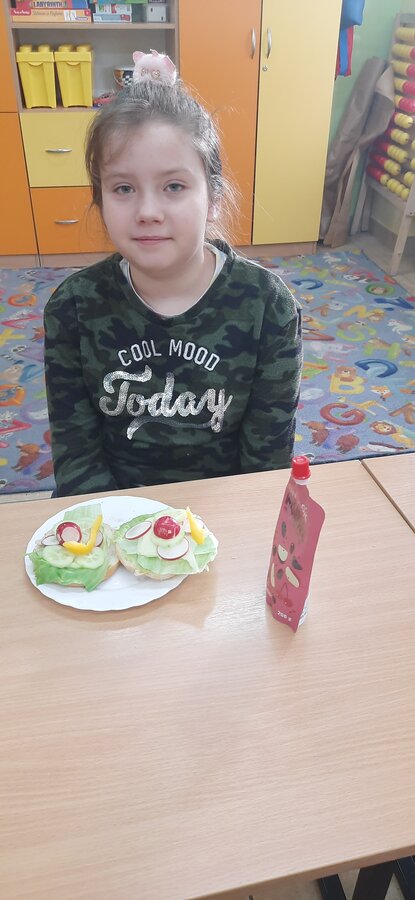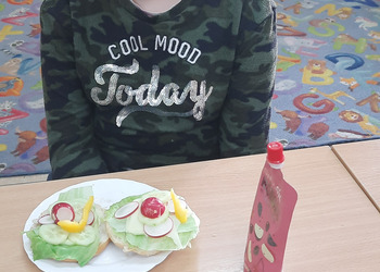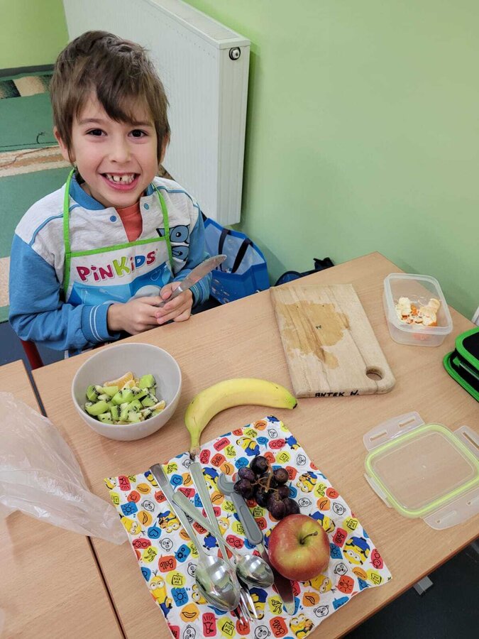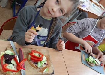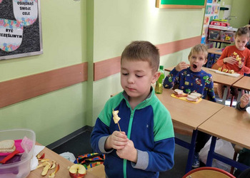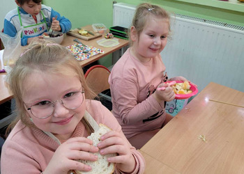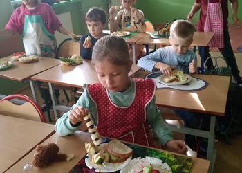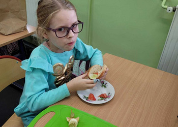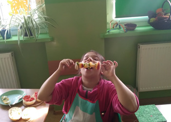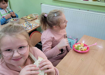 Nie zapomniano o nawykach higienicznych i estetycznym podaniu posiłku. Na wszystkich twarzach promieniał uśmiech. Śniadanie było pyszne, niecodzienne- palce lizać!