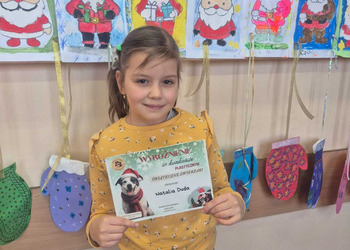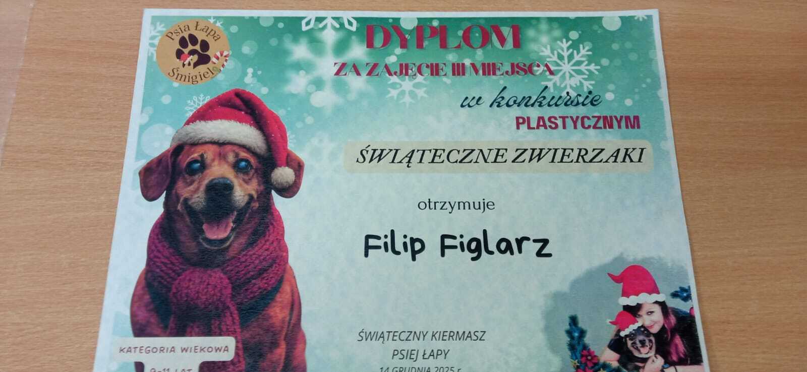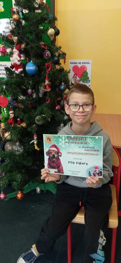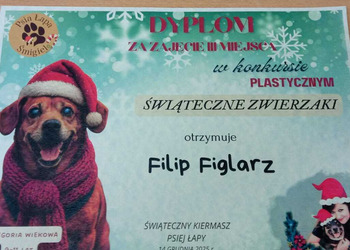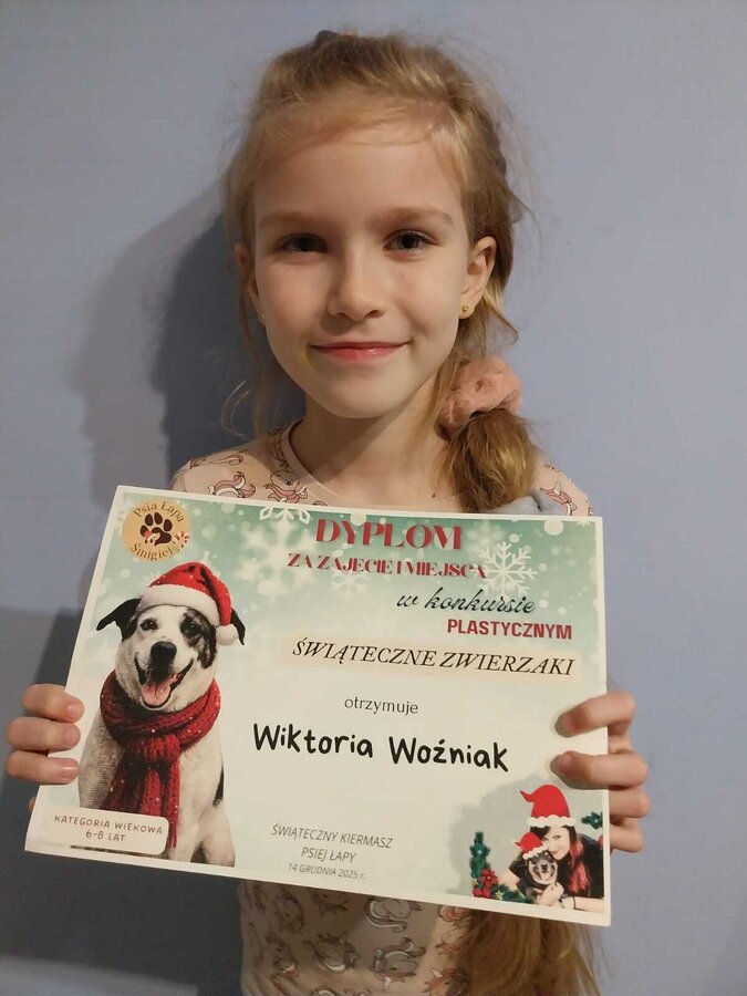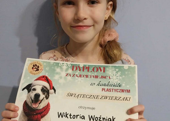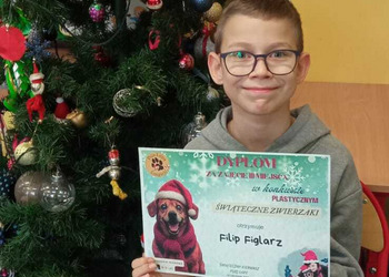 Jak co roku Stowarzyszenie "Psia Łapa" organizowało dla uczniów naszej gminy konkurs plastyczny "Świąteczne zwierzaki". Miło nam poinformować, że z ponad 100 nadesłanych prac, nasza uczennica z kl.1a, Wiktoria Woźniak, zajęła zaszczytne 1 miejsce, Filip Figlarz z klasy 3b zdobył 3 miejsce, a Bruno Mykaj z klasy 1a i Natalia Duda z klasy 1b wyróżnienie.