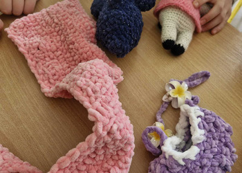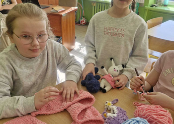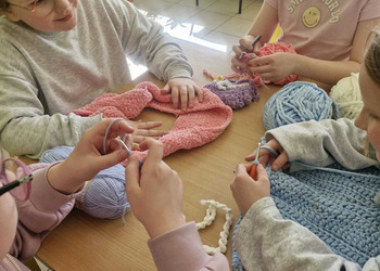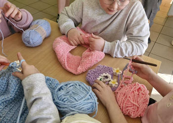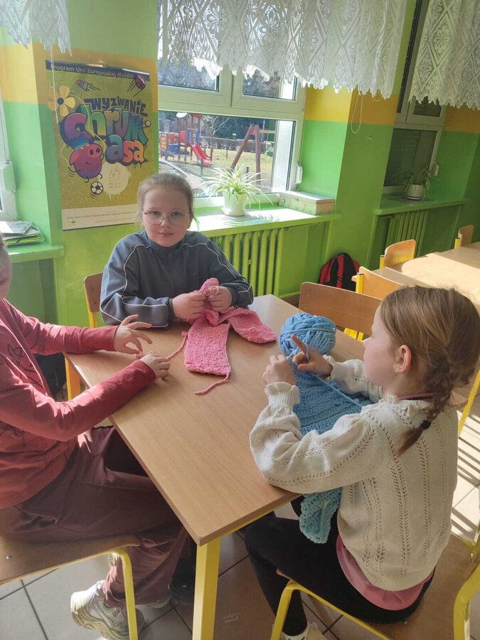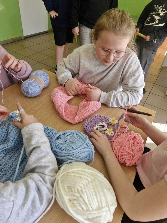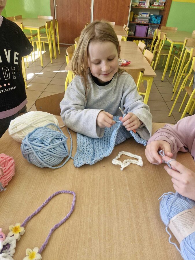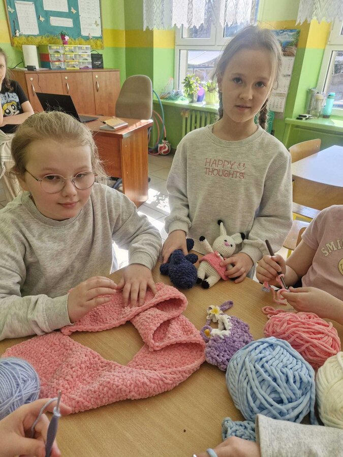 Uczennice klasy 3a bardzo twórczo wykorzystują czas podczas pobytu w świetlicy szkolnej oraz podczas przerw międzylekcyjnych. Zamiast spędzać go przed ekranem telefonu, chętnie sięgają po szydełko i włóczkę. Dziewczynki z dużym zaangażowaniem rozwijają swoje umiejętności rękodzielnicze. Do tej pory stworzyły już wiele pięknych prac - między innymi: szaliki, torebki, biżuterię oraz inne małe cudeńka. Szydełkowanie nie tylko rozwija kreatywność, cierpliwość i zdolności manualne, ale także daje wiele radości i satysfakcji z własnoręcznie wykonanych prac. To wspaniały przykład na to, że wolny czas można spędzać twórczo i pożytecznie, a takie zajęcie jest zdecydowanie lepszą alternatywą niż ciągłe korzystanie z telefonu.