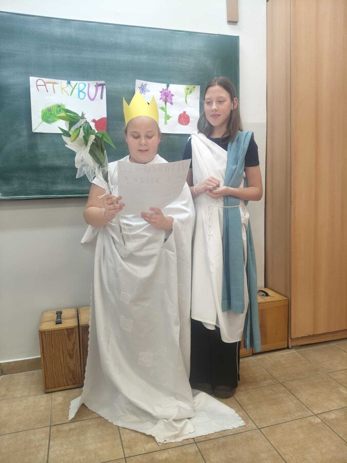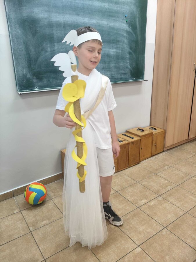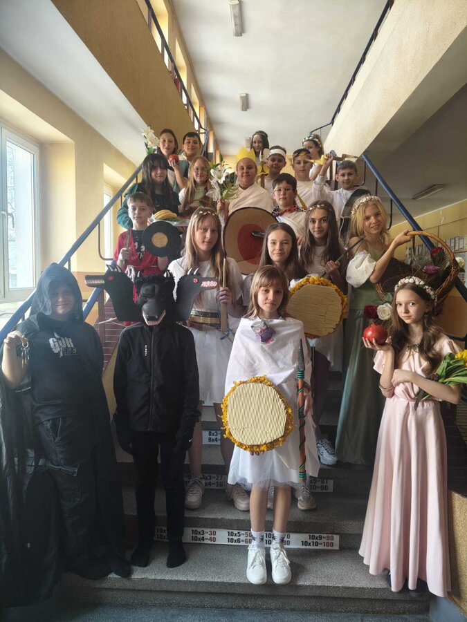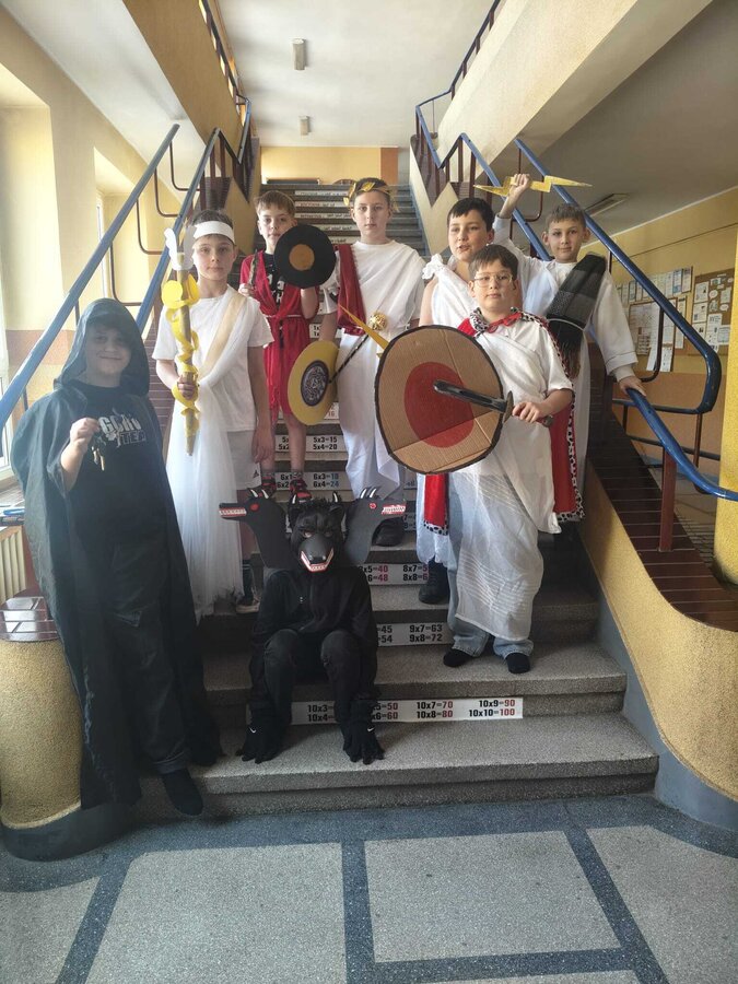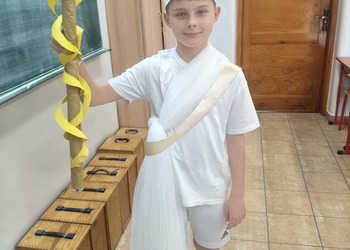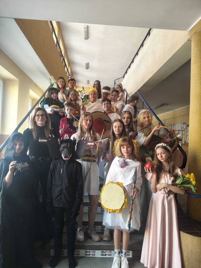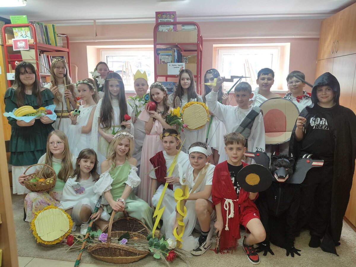Uczniowie klasy 5A postanowili oryginalnie podsumować pracę z mitologią grecką, dlatego podczas lekcji języka polskiego udali się do ciepłej starożytnej Grecji. Starannie i kreatywnie wykonali atrybuty, przebrania, makijaże, by wcielić się w role bogów czy herosów greckich. Przewodził im oczywiście gromowładny Zeus, nie zabrakło również Hery, Afrodyty, Apolla, Hadesa, Artemidy, Hermesa, Ateny, Demeter, Persefony czy Cerbera. Tak oto zacni goście zebrali się na Olimpie na uczcie wydanej przez Zeusa. Każdy z uczniów przygotował prezentację wybranego boga olimpijskiego oraz zagadkę dla rówieśników, aby przybliżyć i utrwalić wiedzę o atrybutach i związkach frazeologicznych pochodzących z mitologii. Bogowie olimpijscy nie omieszkali tego dnia odwiedzić również biblioteki.