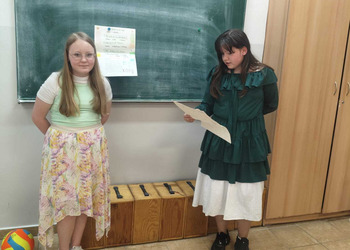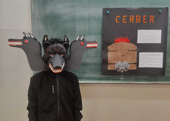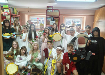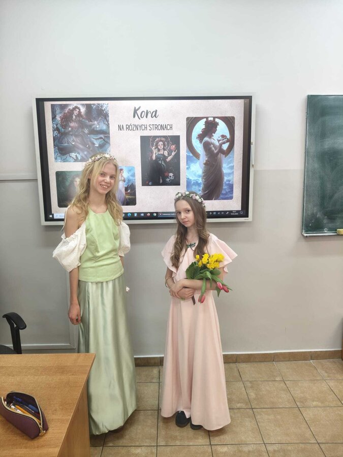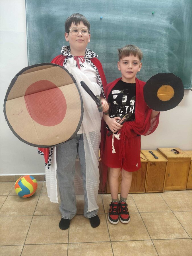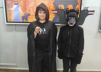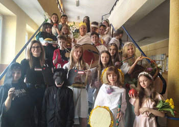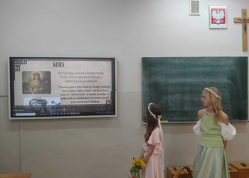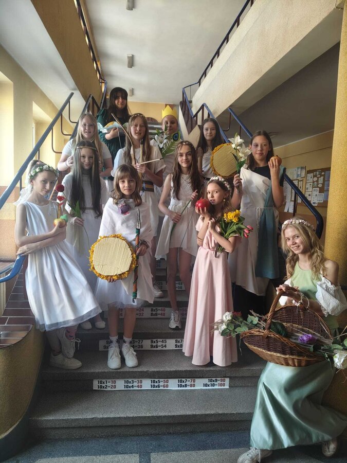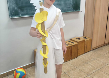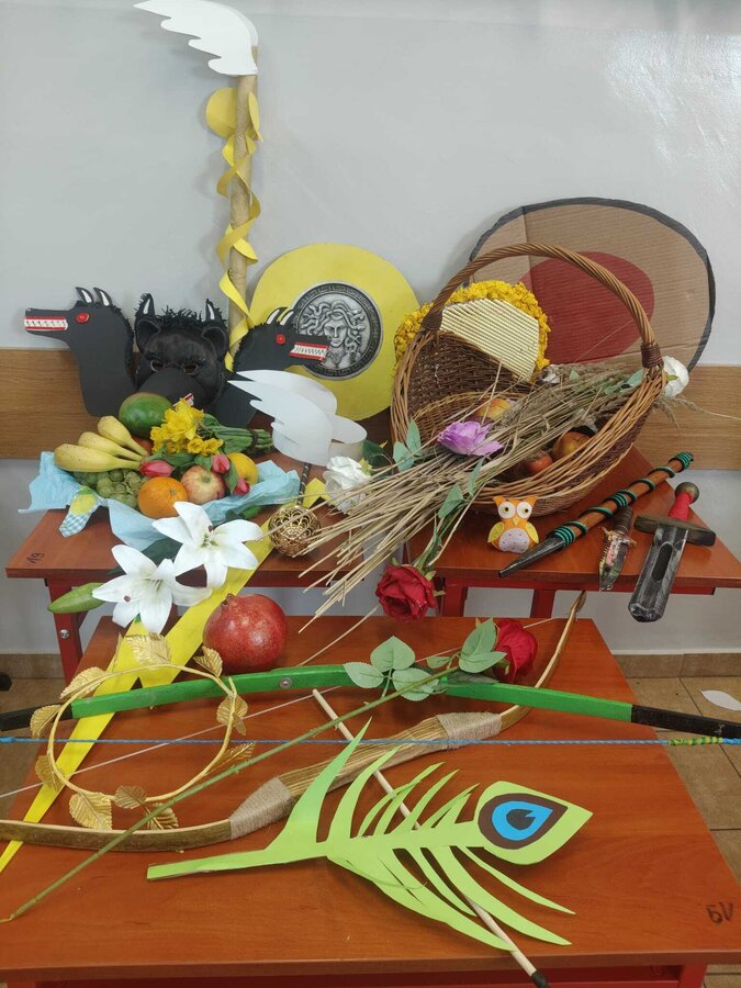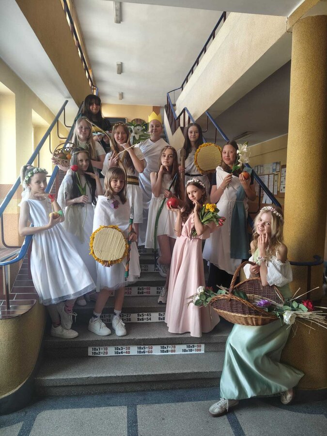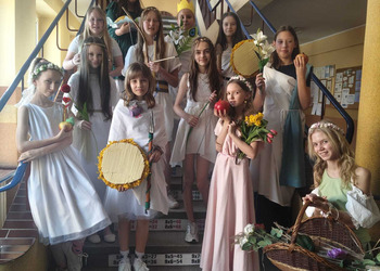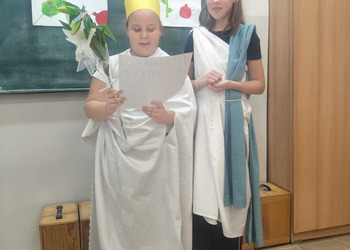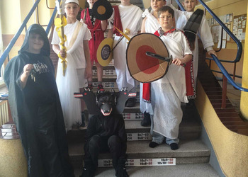 Uczniowie klasy 5A postanowili oryginalnie podsumować pracę z mitologią grecką, dlatego podczas lekcji języka polskiego udali się do ciepłej starożytnej Grecji. Starannie i kreatywnie wykonali atrybuty, przebrania, makijaże, by wcielić się w role bogów czy herosów greckich. Przewodził im oczywiście gromowładny Zeus, nie zabrakło również Hery, Afrodyty, Apolla, Hadesa, Artemidy, Hermesa, Ateny, Demeter, Persefony czy Cerbera. Tak oto zacni goście zebrali się na Olimpie na uczcie wydanej przez Zeusa. Każdy z uczniów przygotował prezentację wybranego boga olimpijskiego oraz zagadkę dla rówieśników, aby przybliżyć i utrwalić wiedzę o atrybutach i związkach frazeologicznych pochodzących z mitologii. Bogowie olimpijscy nie omieszkali tego dnia odwiedzić również biblioteki.